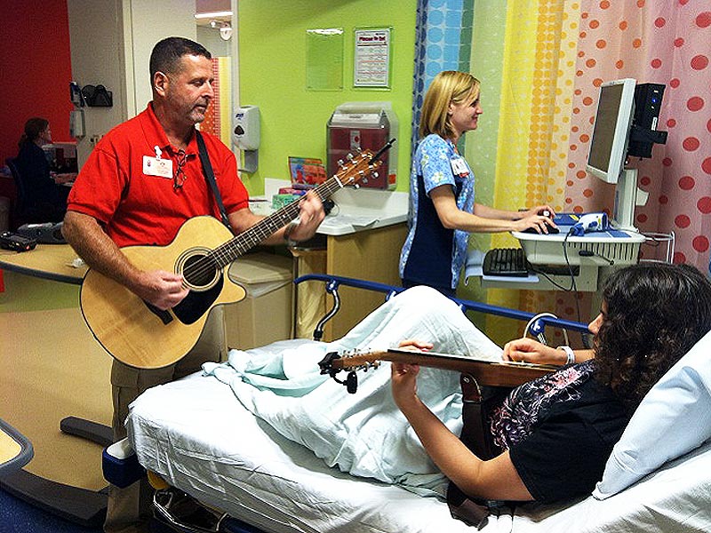 Stephanie Epstein, 26, a music therapist at Holtz Children’s Hospital at Jackson Memorial in Miami, made up a silly song with her patients about the hospital blues. In the song, they complained about the uncomfortable bed, not being able to sleep when they want and how much the needles hurt.