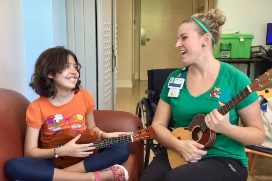 That fateful encounter put Corey on a mission to provide free ukuleles to hospitalized children. Stephanie Epstein, a board-certified Music Therapist at Holtz Children’s Hospital at Jackson Memorial in Miami, Florida, is the President of the UKC. “I met Corey about five years ago when I was starting my music therapy program at Holtz. I had heard about the Ukulele Kids Club from other music therapists. So, I reached out to see if I could start getting donations.” Corey hand-delivered the first donation of five ukuleles to Holtz which, in turn, led to working directly with Stephanie. “I kind of became Corey’s go-to for information concerning music therapy, and our professional relationship from there just blossomed.” Stephanie went on to become Director of Music Therapy for UKC and currently holds the position of President.