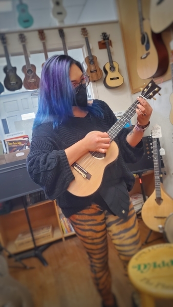 This is where the ukulele came in. Every time I picked it up, it made me smile. Cradling this small instrument close to my heart, I felt its vibrations and heard its melodic voice. I learned how to play through online resources, especially podcasts and tutorials on YouTube. I found a community, sharing joy with people from a distance. When the COVID-19 pandemic hit, I was able to keep these connections to the ukulele world, finding joy even as the word “normal” was redefined on a global scale. Unlike my piano, or even my guitar, I could stay in bed and cradle an ukulele, still able to make music even if the pain and fatigue made other things impossible.