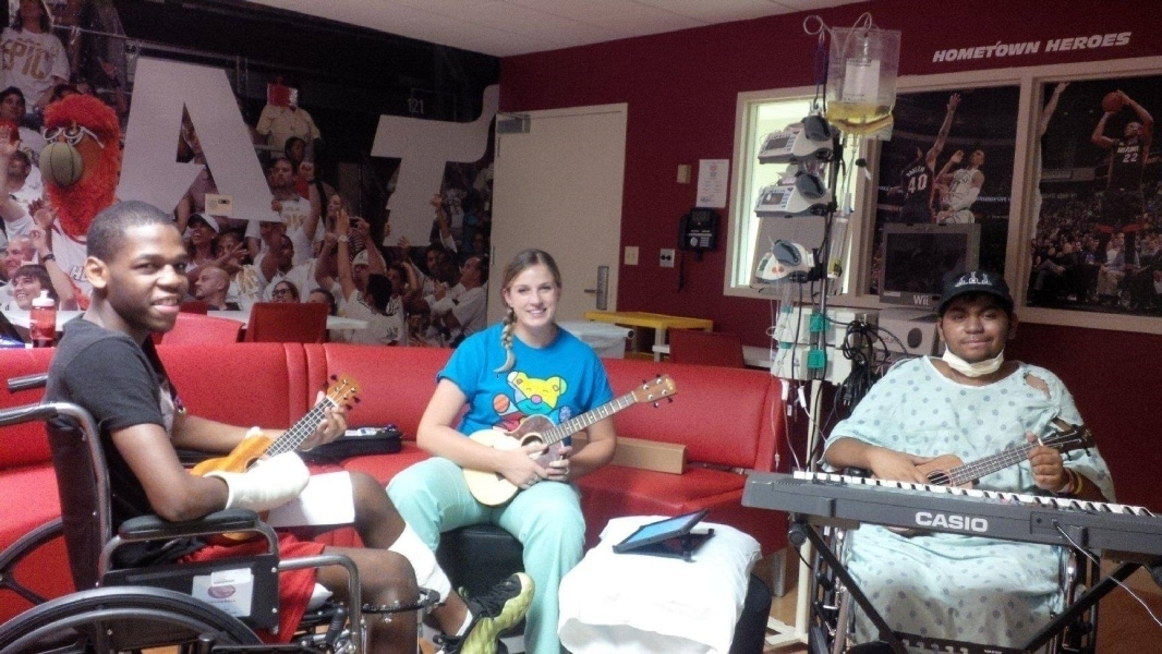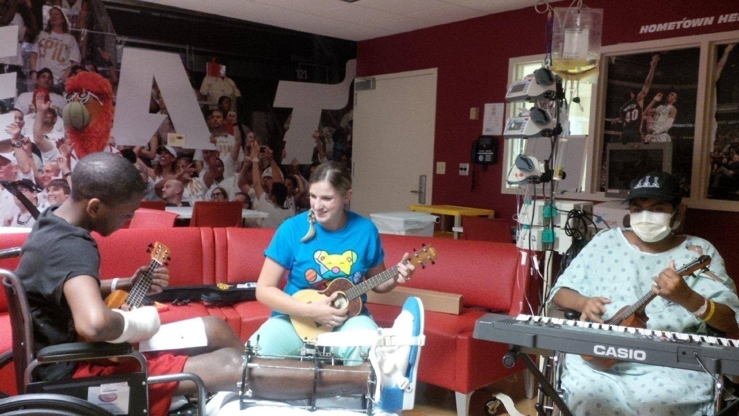 Here are some pictures from a “jam session” that we organized between two incredibly talented patients, Brendon and Drequan. Brendon is rocking the UKC hat as well! Neither guys have gotten to have a lot of interaction with peers their own age, so it was great to see them not only jamming together, but discussing their diagnoses with each other openly. They also shared ways to cope with what they’re going through both physically and mentally, which of course included music!