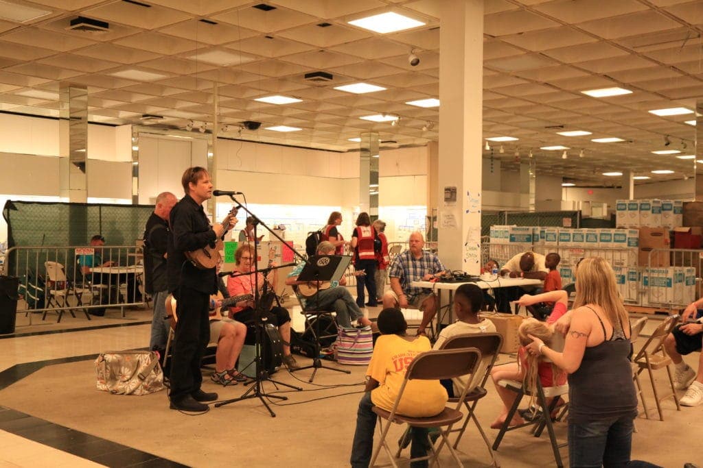 Shelter residents and volunteers gathered to the sound of a live band, featuring the ukulele, playing at the Greenspoint Mall Shelter in Houston. Children sang along to nursery rhymes, while older residents sang along to the classics as the Ukulele Kids Club performed for people who remain displaced after Hurricane Harvey. Joy radiated from the crowd, demonstrating the happy and healing powers of music.