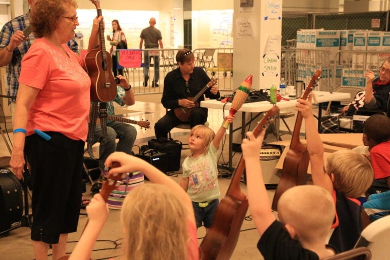 Club members answered the call to help, and word spread quickly among musicians. Not only were they willing to play, but local instrument builders generously donated 100 ukuleles.